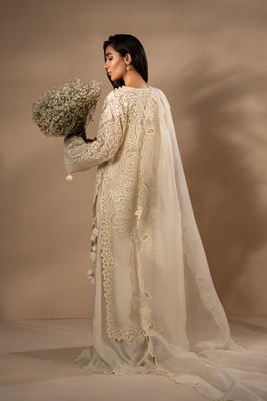 A sublime creation in ivory, this khaddi corduroy A-line shirt is adorned with flowing botanical aari embroidery that appears seamlessly woven into the fabric. Flared sleeves with scalloped borders and pompom accents add a delicate flourish, complemented by a cutwork hemline. The neckline and sides are finished with crisscross dori and playful tassels. Paired with a cascading organza dupatta featuring cutwork edging for an artisanal touch, and khaddi silk flared pants with intricately scalloped hems and tailored side pockets.