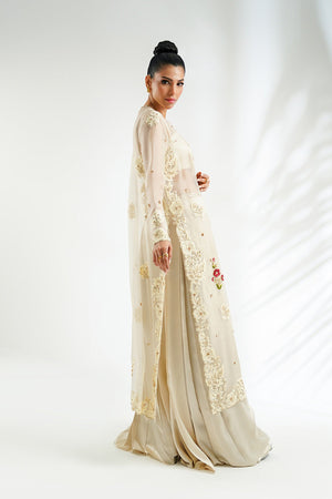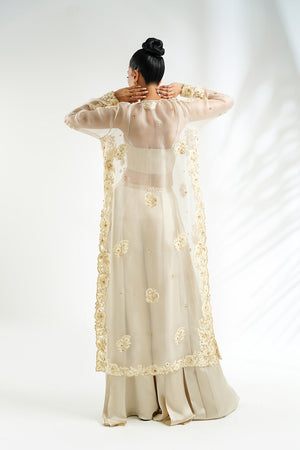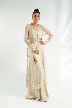 Look ethereal in a scalloped ivory organza front open jacket, embroidered with statement resham and aari details in a pearly hue with accents of crimson floral bouquets and glistening sequins. Taking cue from the embroidered borders of the organza shirt, the slim fit sleeves have scalloped edges. Paired with a matching tube top and palazzo pants cut from the softest charmeuse.