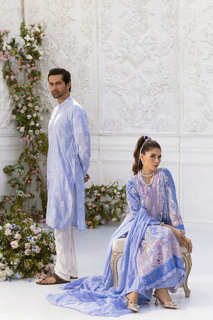 Delicate lilac sets a soft, romantic tone for this long shirt, enhanced with tilapatti detailing and bell sleeves for added femininity. The matching izaar brings balance to the flowing silhouette, making it a perfect choice for daytime gatherings or casual celebrations. It’s understated elegance at its finest.