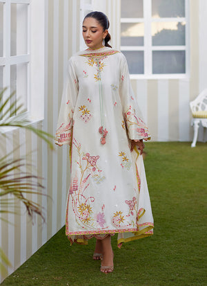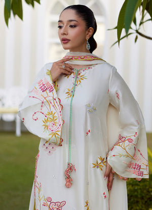 A statement in contrasts, crafted for the modern muse. This pure, raw silk shirt in a prisitine ivory hue, is elevated with intricate embroidery in vibrant zingy hues. Delicate hand embellishments, and thoughtfully placed appliqués create rich dimension and texture. Contrasting trimmings and raw silk borders bring a bold edge to the design, while sequin hangings add subtle movement and sparkle. Finished with a medium silk dupatta featuring contrasting raw silk borders, this ensemble delivers timeless elegance with a distinctly fashion-forward attitude. The matching embroidered izaar pants echo the same refined detailing, striking a perfect balance between structure and fluidity