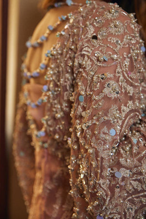 A flattering silhouettes is adorned with intricate motifs and delicately embellished borders with crystals, sequin and thread on a sublime shade of pink. Hanging tassels are stitched on sleeves and bottom edges of the shirt to create a luxurious graceful look. ?Ensemble: 3 Piece