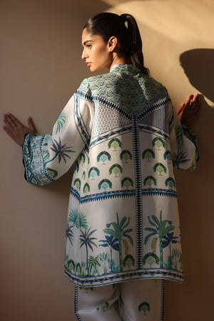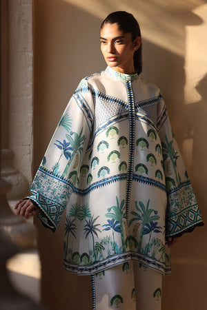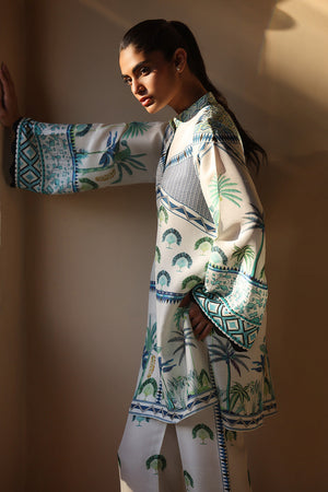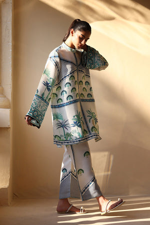 An ode to nature’s poetry, this rawsilk ensemble is cast in a luminous ivory hue. Adorned with a tropical inspired print in azure and jade tones, the relaxed top with a band collar, pairs effortlessly with matching culottes featuring a symmetrical print.
