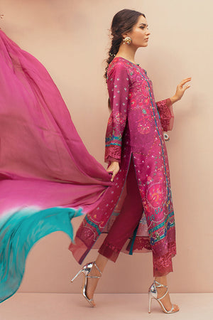 Medium violet pure rawsilk digital printed silk kurta paired with matching pants and a luxe ombré dupatta.