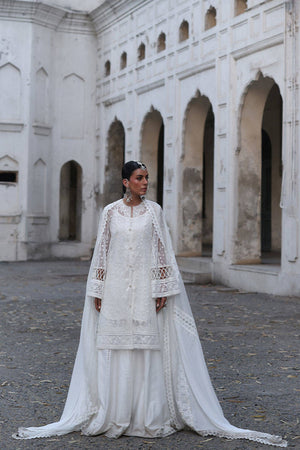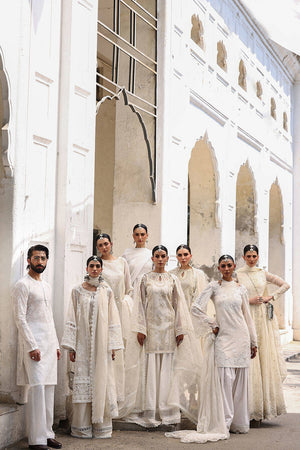 A sheer white shirt that has both traditional technique and modern finesse. The fabric is embroidered with boring work—an heirloom method that carves lace-like designs into the surface—while floral borders edge the shirt with lyrical delicacy. Sleeves and hem are finished in a pearl-stitched doori trellis, adding structure to the softness. The sharara features cotton trims on each panel, offering a rhythmic balance, and the dupatta brings together two textural layers—chiffon and khadi net—both detailed with decorative trims. This Eid ensemble balances craft and comfort in equal measure.