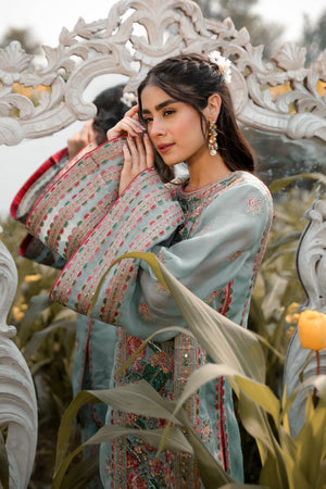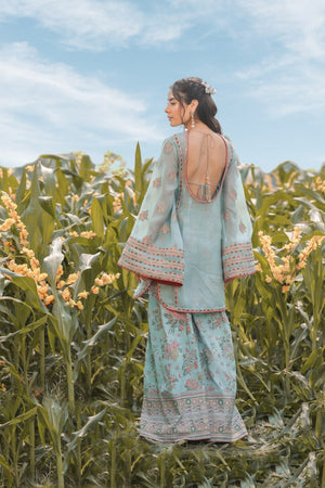 A stunning ice blue heavily multi-colored embellished short shirt with round hem, extravagant bell sleeves with heavy borders paired with screen printed raw silk plazo pants.