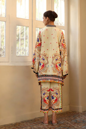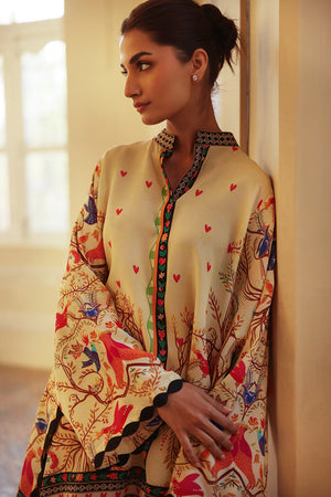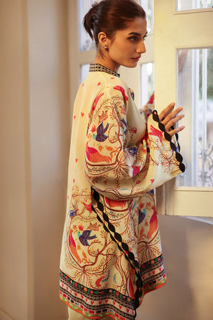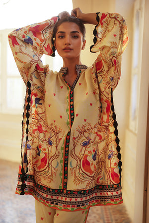A whimsical cream hued pure co-ord set cut from crepe, is printed with vibrant avian artistry and autumnal vines. Playful printed borders frame the relaxed silhouette, paired seamlessly with matching trousers.