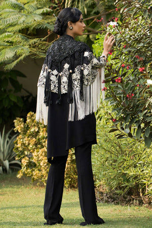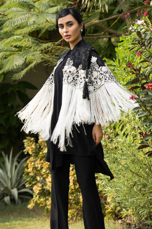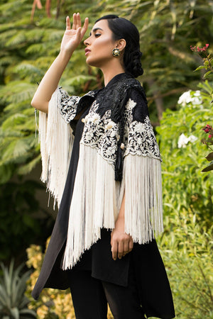 Monochrome dori embroidery fringe cape-let. Embellish with sea shell includes an asymmetric black inner top.Color: Black & White