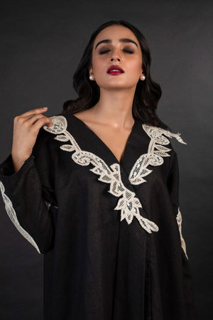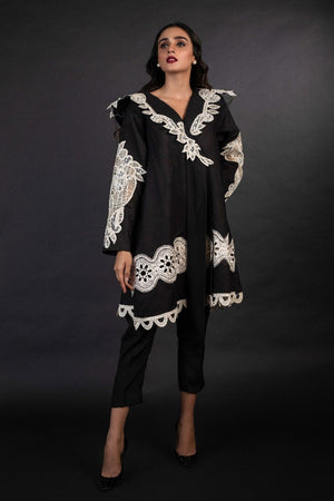 Irish linen tunic with royal cutwork collars and sleeves.Color: Black