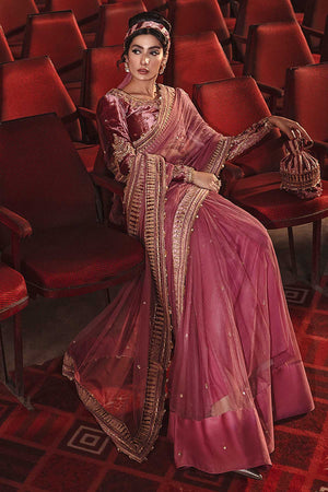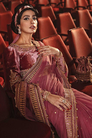 Eman wears Noor Jehan, a 3 piece attire consisting of a rose lavender velvet choli with tila marori and moti embellishments worn with a beautiful net saree with carefully placed spray of floral bootis and a heavy tila border consisting of elaborate satu motifs. She carries a stunning hand embellished velvet potli.Fabric: Net