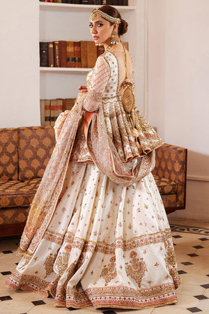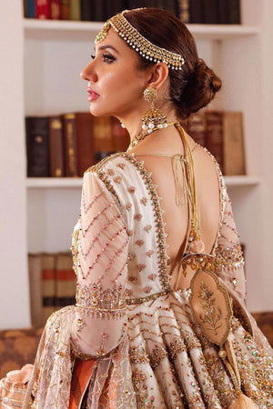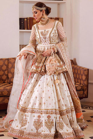 A modern twist in a peachy combination brought together through Indian silk lehenga and organza peplum embellished with intricate gotta work and thread embroidery. The look is creatively put with two dupattas and a velvet pouch.Fabric: Silk