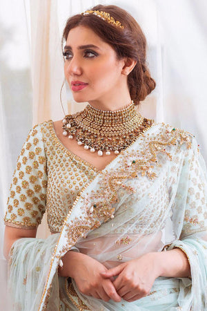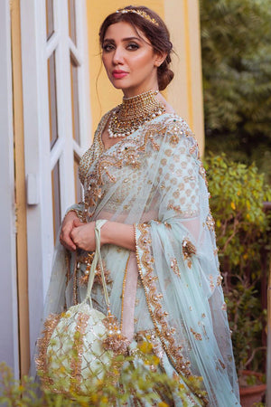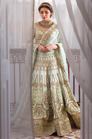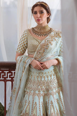 A dreamy amalgamation of mint green bridal embellished with pearl, zari and dabka work. The outfit glistens being a pure bliss combining beautiful dupattas of net and organza along with a complementing velvet pouch.Fabric: Silk