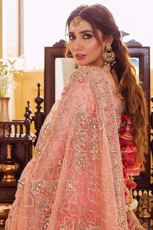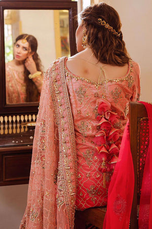 A fresh fruity bridal of enriching brocade gharara paired with a raw silk long shirt. Uplifting the fairy tale of this outfit is the awe-inspiring gota and pearl work. The outfits form a statement with a net and an organza dupatta accessorized with a chic velvet pouch.Fabric: Raw Silk