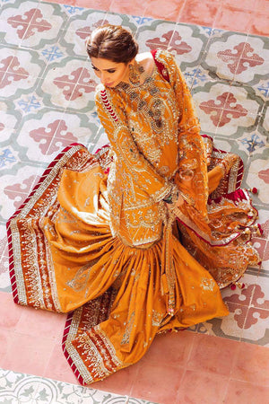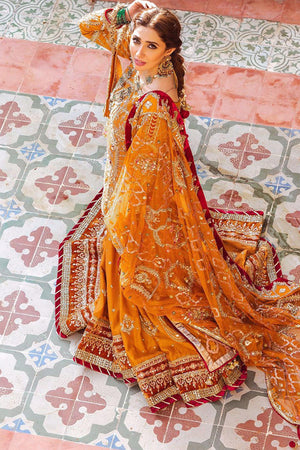 A sensational combination of tangerine put together as a tribute to mistresses of great Mughal dynasty. The outfit radiates; beautiful Missouri fabric embellished with bead work, naqshi and sequence come together with beautiful net and organza dupattas. A Missouri pouch ad to the beauty and elegance.Fabric: Silk