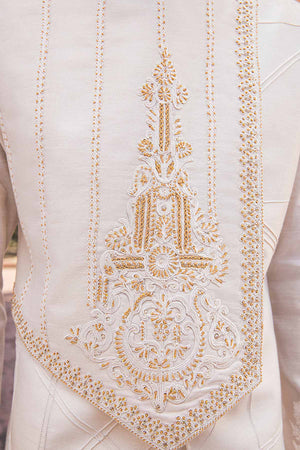A paneled and layered white cotton net summer waistcoat that sports multi-dimensional embroideries of tila and resham with some texture added by cut dana. The Maison’s favorite summer essential is the cotton net dori embroidered kurtas. These are carefully curated and hand knotted by our artisans with love for your summer wardrobe fix.Collection: Yaar Beili