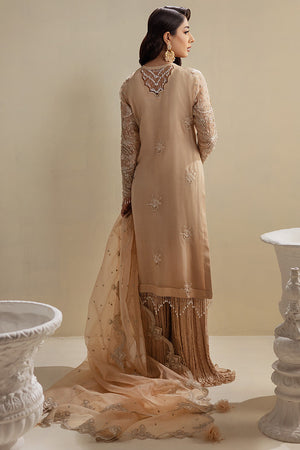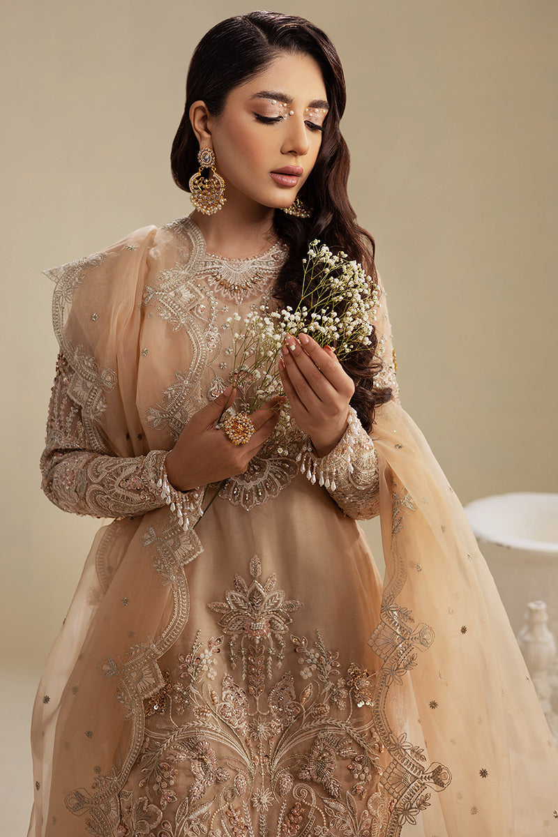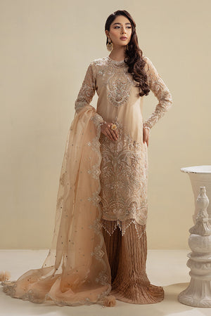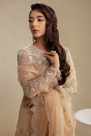Presenting the exquisite "Mocha Beige" ensemble, a true embodiment of elegance and grace. This premium organza outfit is a masterpiece that boasts resham embroidery delicately gracing the front, back, and sleeves of the shirt.