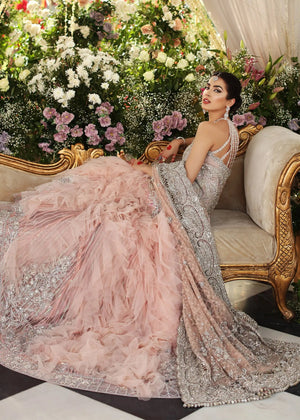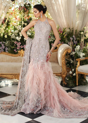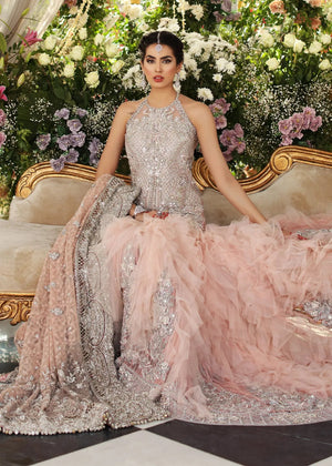 A first trail ruffle sensation is crafted with this dusty pink net with halter neck liberally embellished with pearls dabka works. Paired with net dupatta voluminous layered net ruffled on the bottom with embellished border.The shipping charges for all articles barring Bridals are as follows: