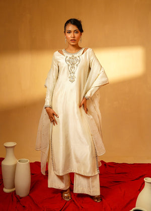 Description: Draped in cream silk with intricate silver embellishments, Monaraue exudes timeless grace and regal charm. A masterpiece where luxury meets tradition.