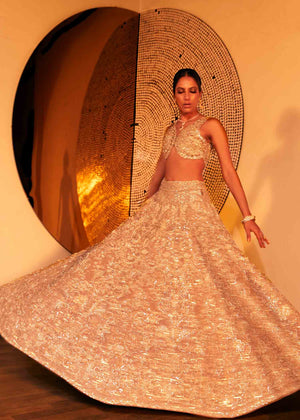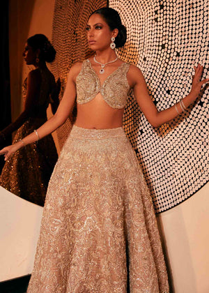 Description: Monique is adorned with classically styled, handworked embroideries of Subcontinental origin and features exquisite embellishments crafted over an ash pink base that makes this statement piece one of its kind. A beautifully cut diagonal top is paired with a heavily hand embellished, flared lehenga and the look is brought to a stunning finish with an exaggerated tullè cape. Silhouette- lehanga and choli paired with exaggerated cape, if client doesn't want cape, the cape can be customised into a dupatta with same work as cape, same borders on 4 sides and same jaal in the middle.