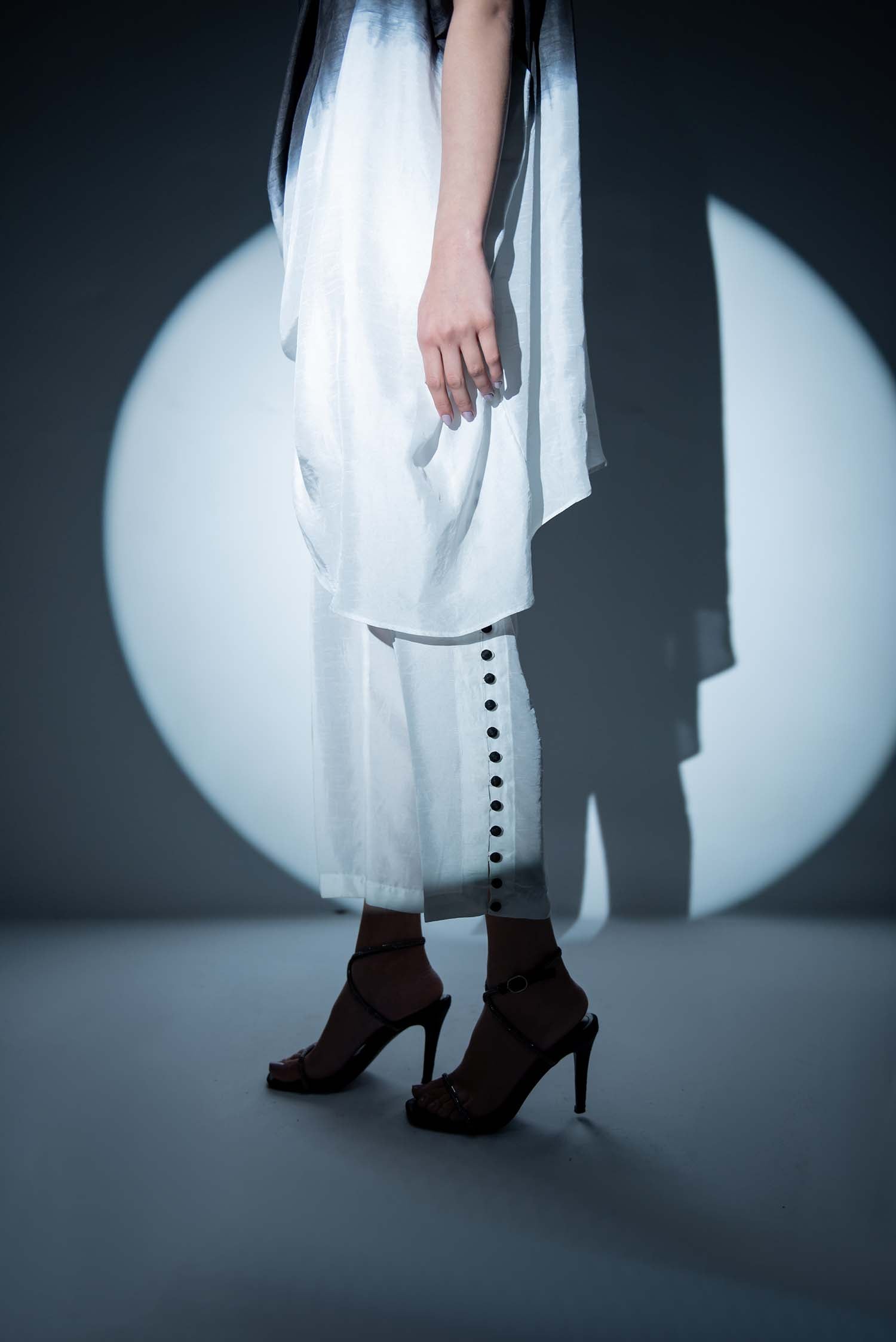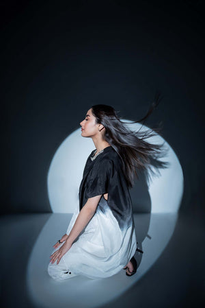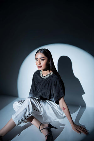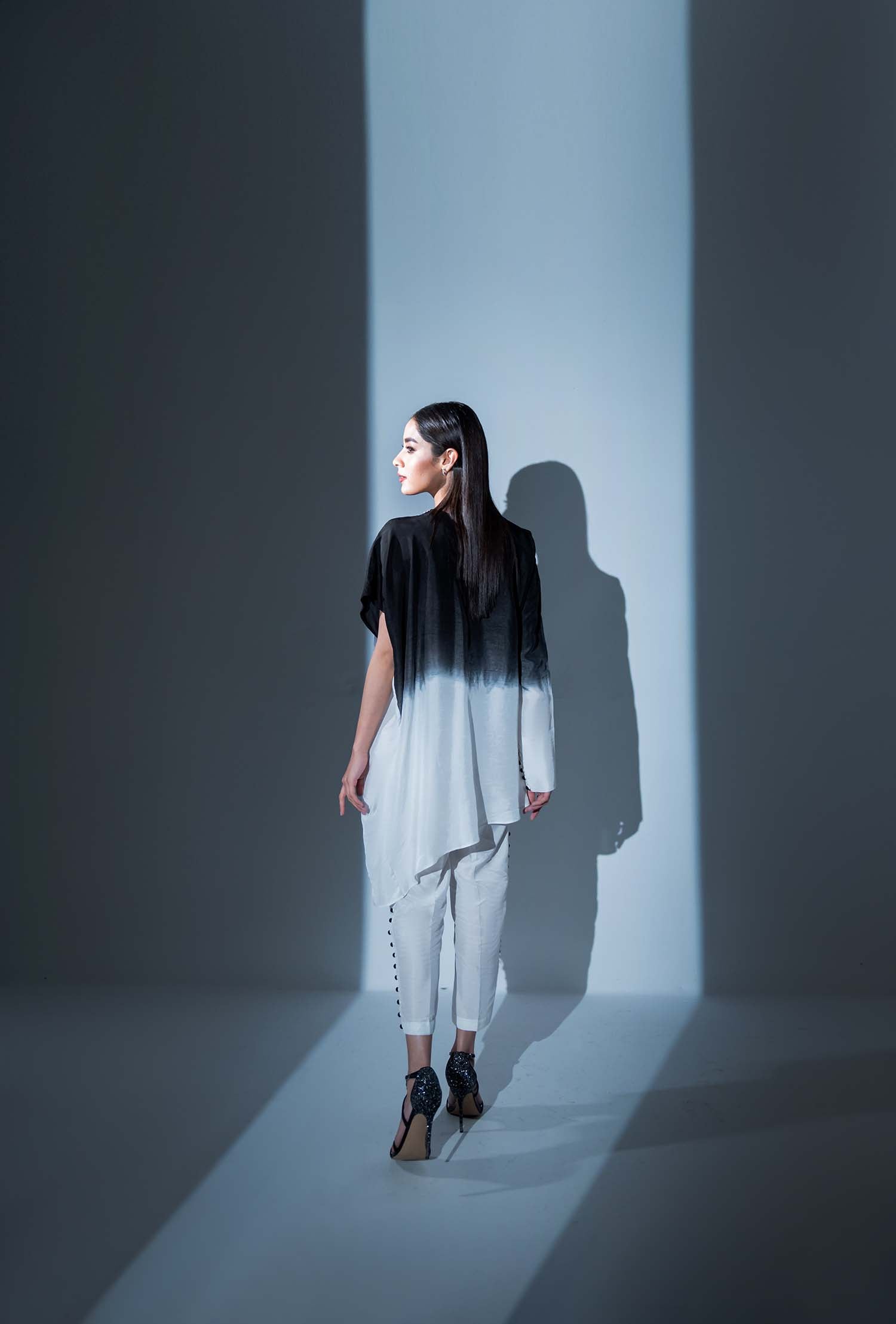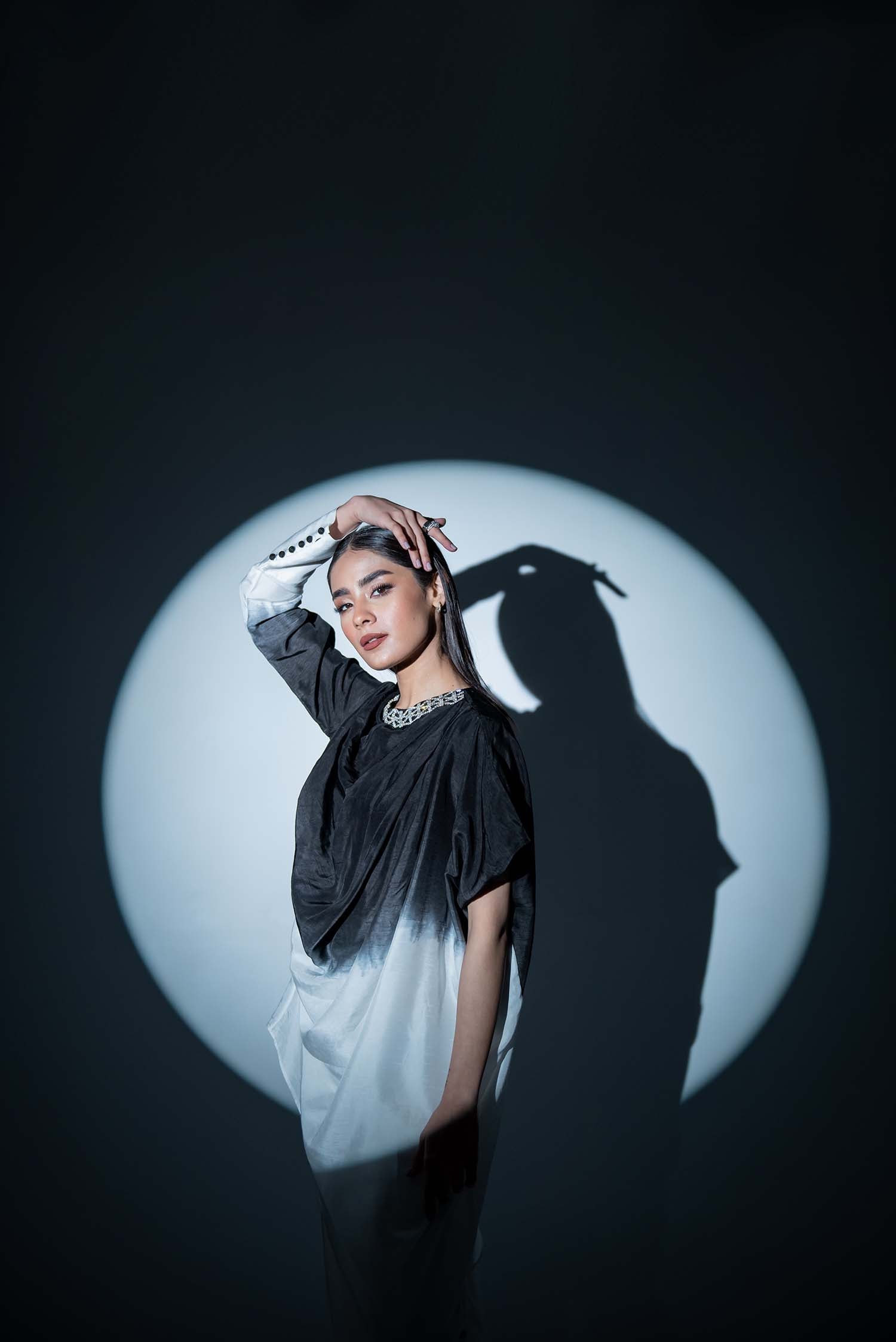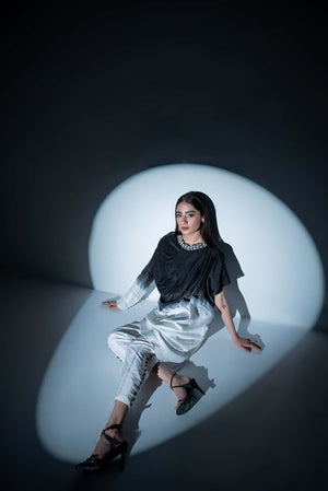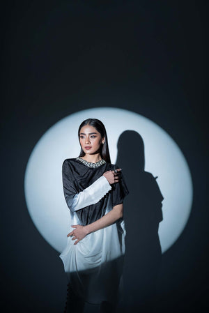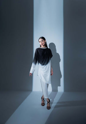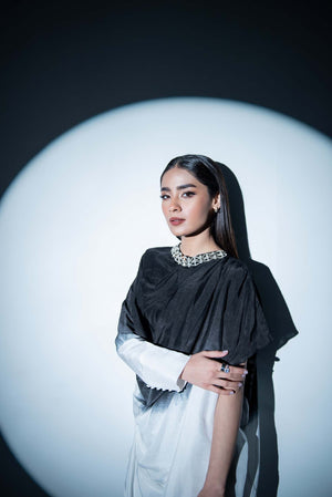 Make a bold statement at your next festive celebration with our Black and White Diamond Fusion outfit. Crafted from the finest raw silk in a timeless black and white palette, this luxurious piece is elevated by shining faux diamond neckline embellishments that sparkle and shine with every move. Perfect for a fusion of western and eastern styles, this outfit is the epitome of sophistication and style. So why wait? Elevate your wardrobe to the next level