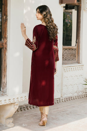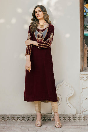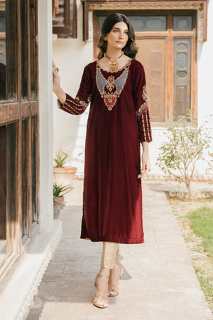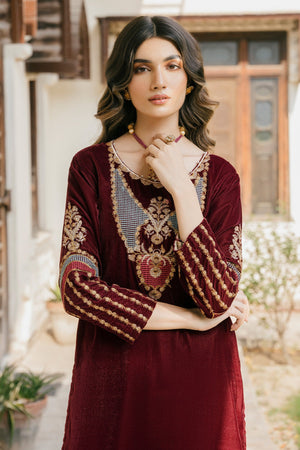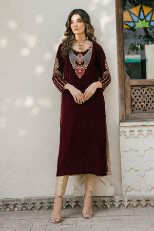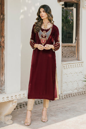 Introducing Monochrome, a timeless piece of luxury crafted with exquisite detail. A maroon tilla embroidered neckline and embroidered sleeves capture the eye, while the modern cut front and jamawar pants provide a classic silhouette. An elegant look for any occasion.
