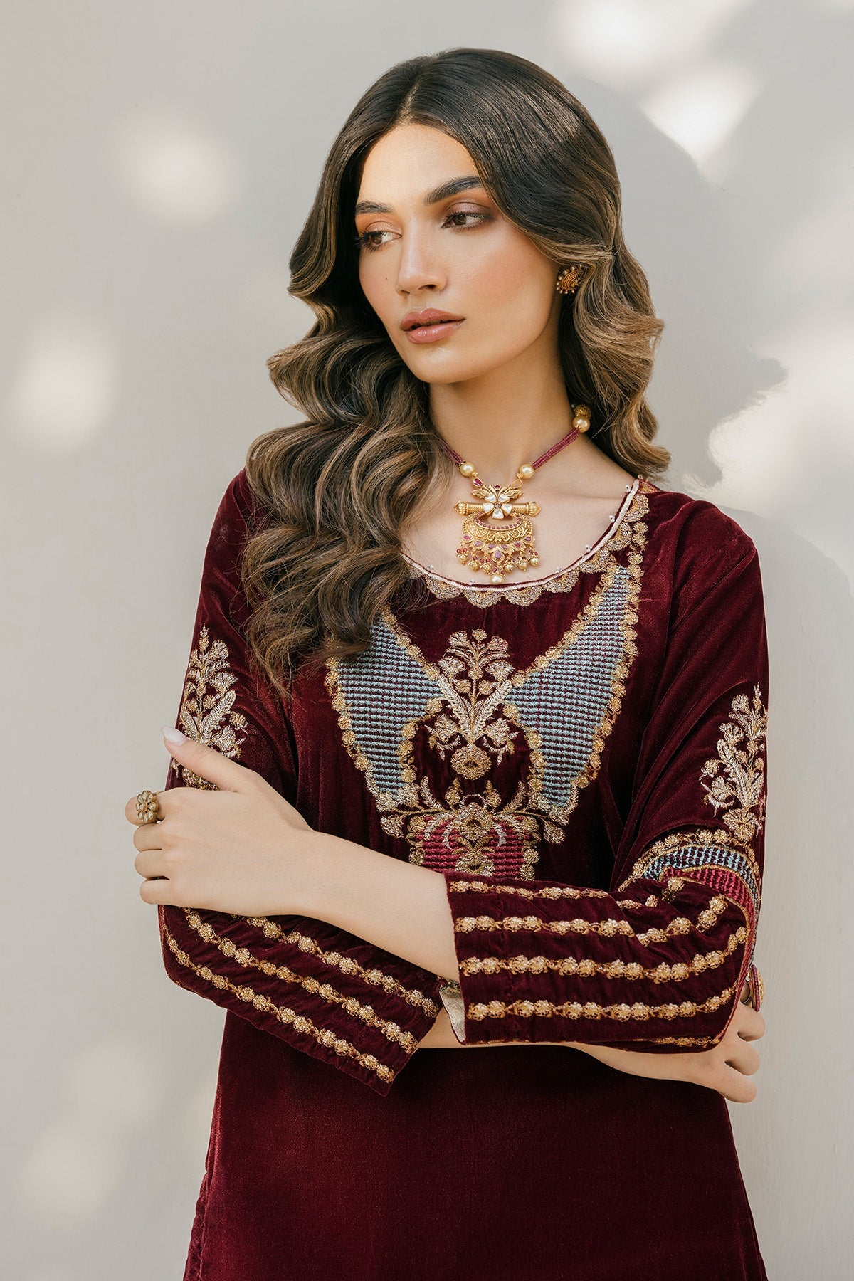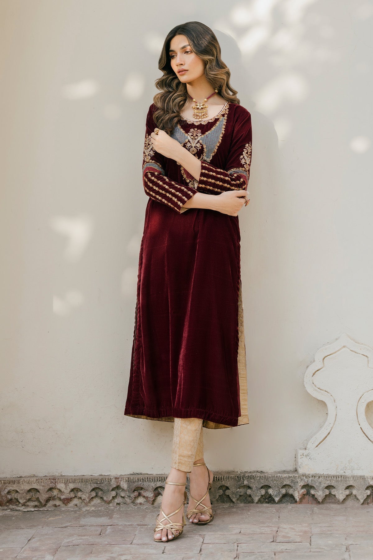 Introducing Monochrome, a timeless piece of luxury crafted with exquisite detail. A maroon tilla embroidered neckline and embroidered sleeves capture the eye, while the modern cut front and jamawar pants provide a classic silhouette. An elegant look for any occasion.