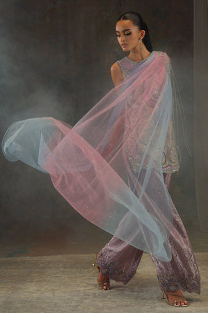 Radiating an otherworldly charm, this shimmering zari net shirt is paired with a regal jamavar farshi shalwar, creating a silhouette steeped in tradition yet alive with modern grace. The shirt is a canvas of meticulous hand embroidery—delicate florals, scrolling vines, and jewel-like accents that glisten in soft pastel hues. Comes with an embroidered banarsi farshi shalwar. Draped over the shoulder, the ombré net dupatta fades from rose to sky, its edge anchored with an intricately beaded floral motif that mirrors the embroidery’s poetry. Light, fluid, and luminous, this look is made for festive evenings where elegance must speak in whispers, not shouts.