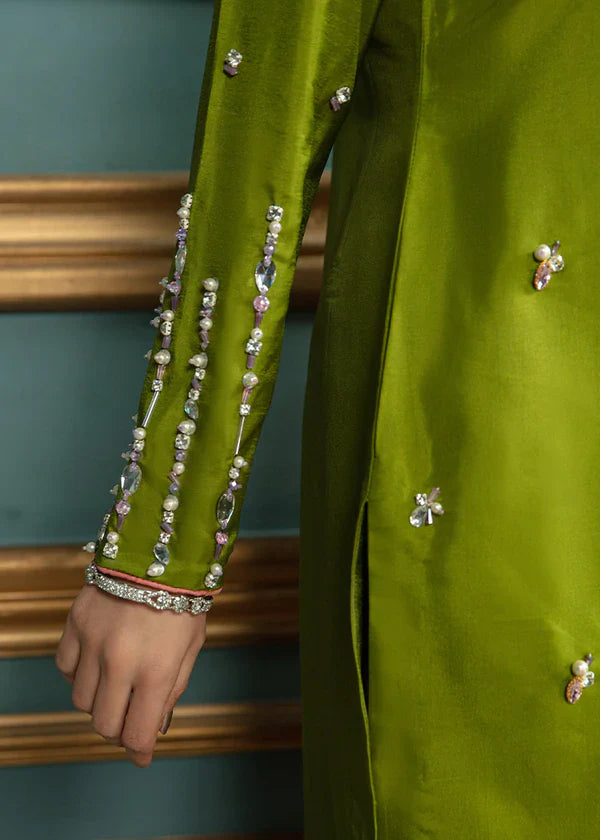 A pleasant green silk matching separate features boat neck with wide slit, long sleeves and medium length. Neckline and sleeves are hand embellished intricately in petal pink & silver tones, front sprayed all over with hand work! Paired with color block dupatta and cig pants to complete the look!