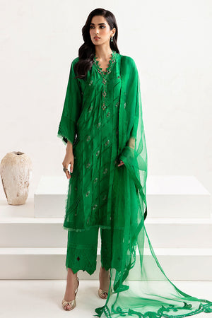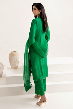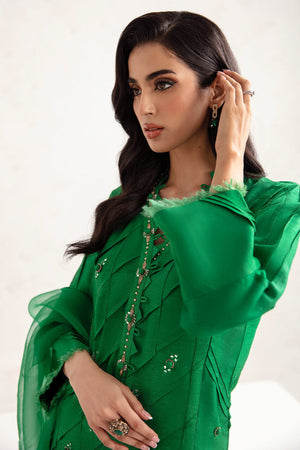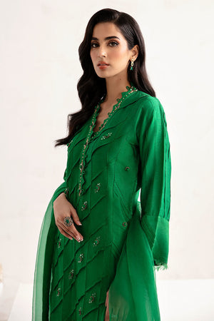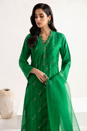 Our elegant solid green outfit is a standout piece, highlighted by its embellished V neckline. The shirt is beautifully adorned with pleats and intricate zari work motifs. Pair it with our pleated detailed azaar pants for a harmonious ensemble. The accompanying organza dupatta features embroidery and cutwork on it.