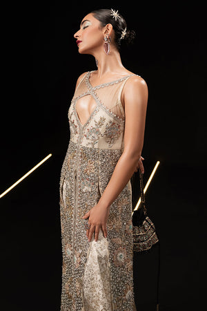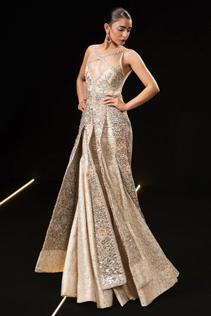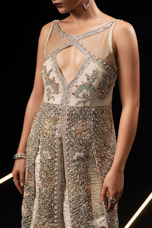 A timeless masterpiece in off-white, 'Motia' features an intricately embellished halter dress paired with a mermaid lehnga. The Zari net shirt, adorned with waist-high slits, showcases exquisite handwork including gota, dabka, naqshi, Swarovskis, pearls, sequin, and thread work. Complementing the dress is a pure raw silk dupatta, embroidered and accentuated with delicate tissue patchwork, adding a graceful touch. This enchanting off-white ensemble effortlessly blends elegance with allure.