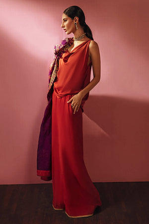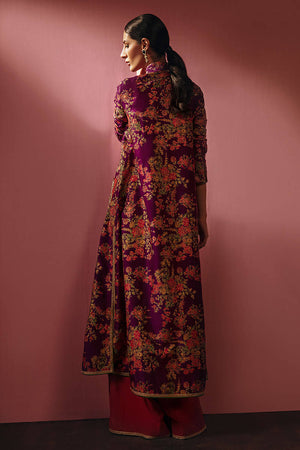 A stunning long button down printed jacket with heavy embellished pockets paired with plain rust inner and high waisted palazzo pants. Shirt Length: 53 Model Height:5'9