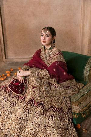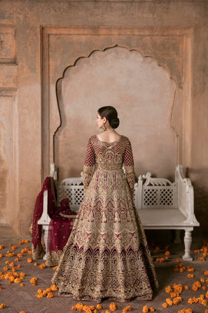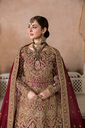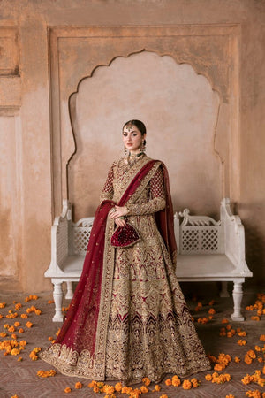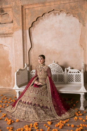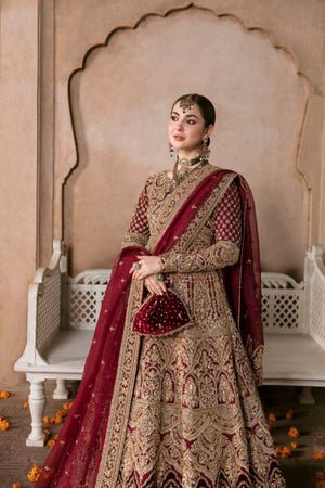 Crafted in Korean silk, with a deep shade of red, Muntaha is a modern silhouette, an epitome of style. The pishwas has a gorgeously hand embellished bodice, with an exaggerated flare of shiny ornaments, such as, naqshi, dabka, crystals, pearls and sequins. Paired with Korean Silk lehanga with heavily embellished border. The look is completed with an organza dupatta with four sided embellished border and extended pallu and spray. This outfit is a fusion of vintage grace and contemporary beauty.Pishwas: Korean Silk