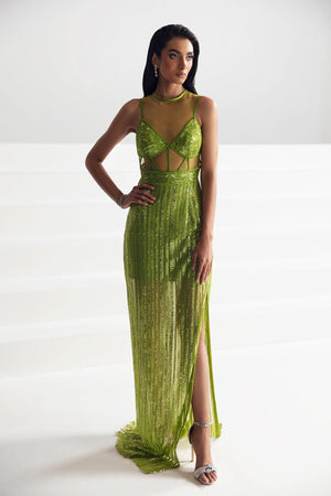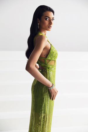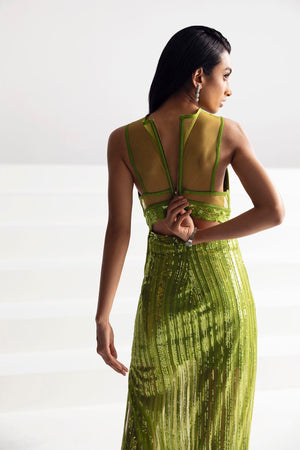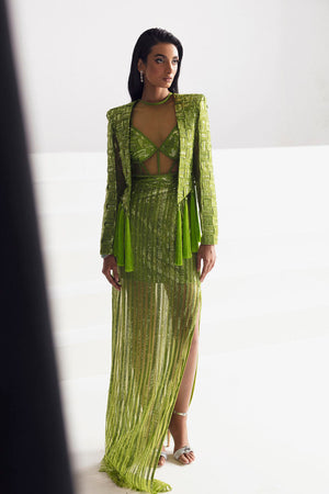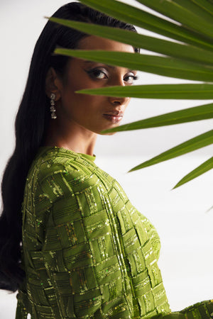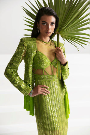 Awestruck by its sheer elegance, this vision in green couture is a sight to behold. A symphony of allure unfolds as the garment drapes over the body, creating a tone-on-tone masterpiece that is both captivating and enigmatic. The sheer fabric creates an illusion of ethereal beauty. Sequins delicately embellish the fabric, glimmering like stars. Each sequin is a testament to meticulous craftsmanship, adding depth and dimension to the garment as they catch the light in a mesmerizing dance. The green couture masterpiece drapes you in a symphony of beauty, where sheer fabric, hand-sewn sequins, and a graceful tana bana jacket harmonize to create a vision that is both otherworldly and irresistibly alluring. This ensemble is more than just clothing; it's a statement of individuality, a manifestation of elegance, and a tribute to the beauty that can be found in every detail.