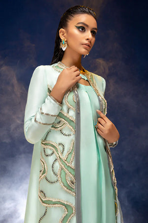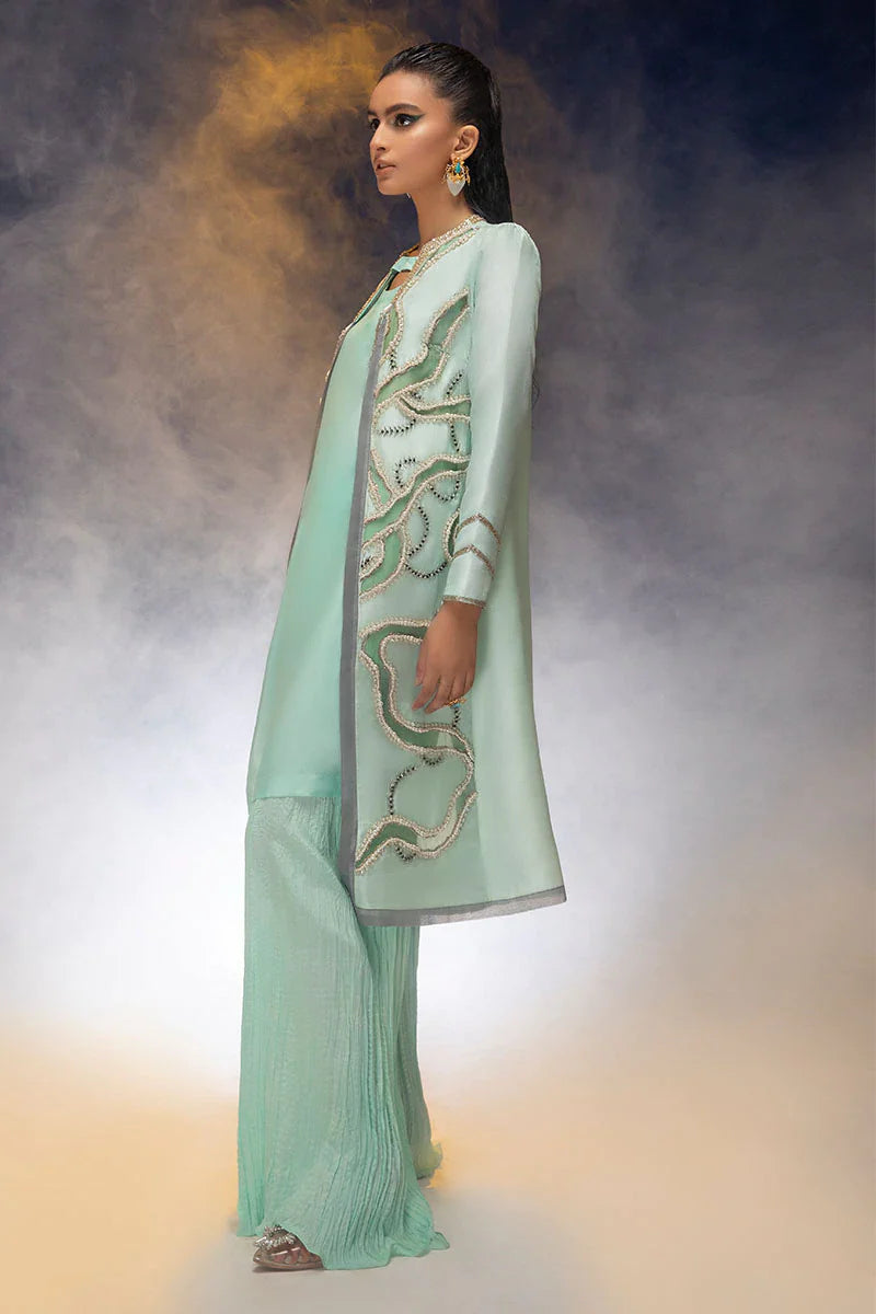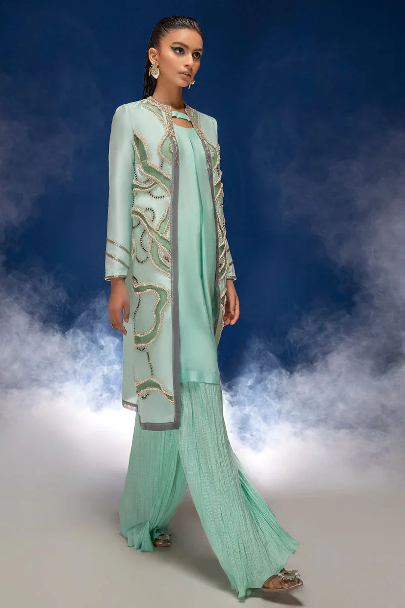Front cropped straight raw silk jacket with crushed loose pants.Hand embellishment in waves of pearls and shiny crystals enhanced with black stones.