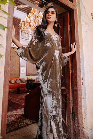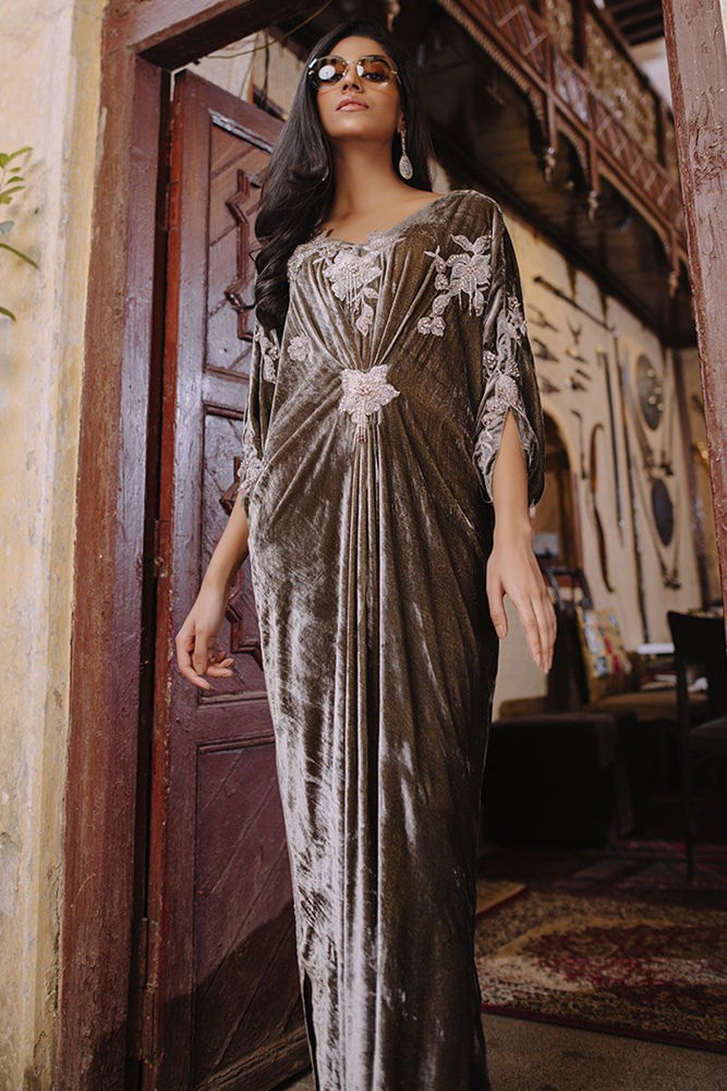 An ultra-modern pure velvet champagne color kaftan with contemporary V-neckline crafted with 3D jeweled flowers made of resham, stones and pearls. Pleats on the waist gives the body a perfect hour glass shape.