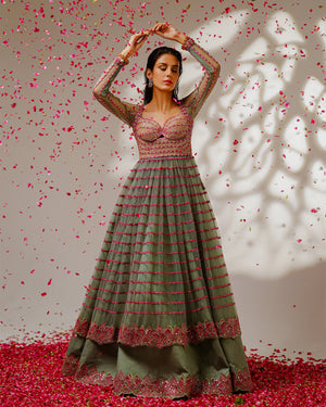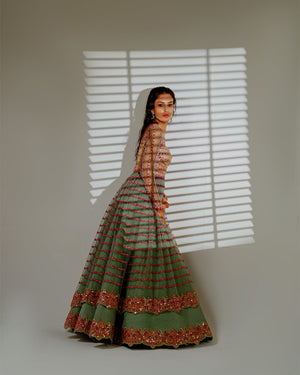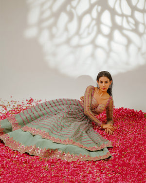 'Elegance meets drama in this show-stopping outfit, featuring a pristine white Pishwas bodice adorned with intricate embellishments, perfectly paired with a rich dark Pista green lehenga. The contrast between the two hues creates a mesmerizing visual effect, making this ensemble ideal for a wedding, formal event, or any occasion where you want to make a lasting impression.'