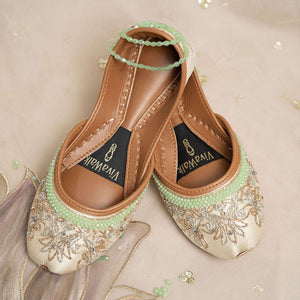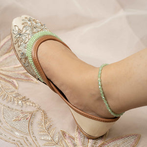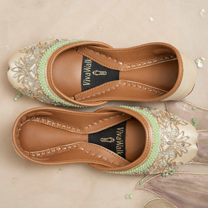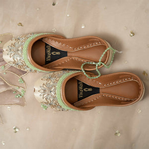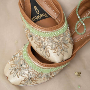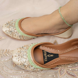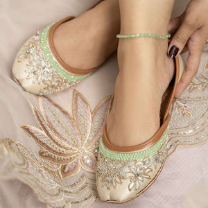Step into a world of enchantment with our “Mystic Muse” khussa, crafted with intricate silver and rose gold naksi and adorned with shimmering crystals. These dazzling shoes are a perfect addition to any outfit, letting your feet be the canvas for elegance and mystique. Whether for a special occasion or adding flair to your everyday style, the “Mystic Muse” khussa promises to elevate your look with magical charm, combining comfort and grace in every step. Embrace timeless beauty and turn heads wherever you go, letting your inner muse shine and dazzle the world with your unique style. Don’t miss out on the chance to step into pure magic with your very own pair of “Mystic Muse” khussa today! Inner lining– leather texture for comfort