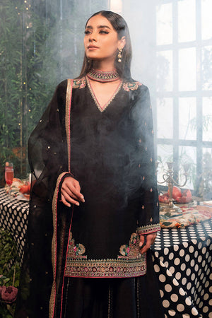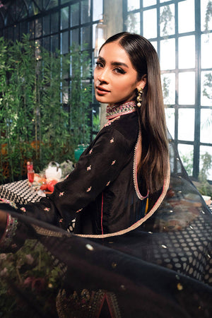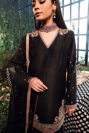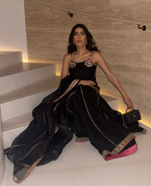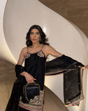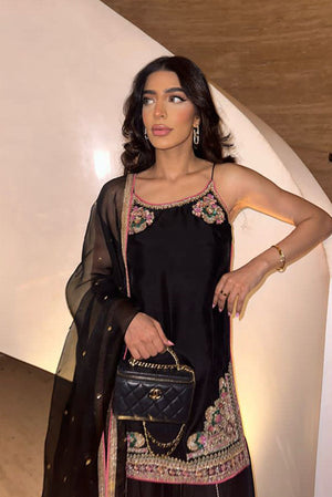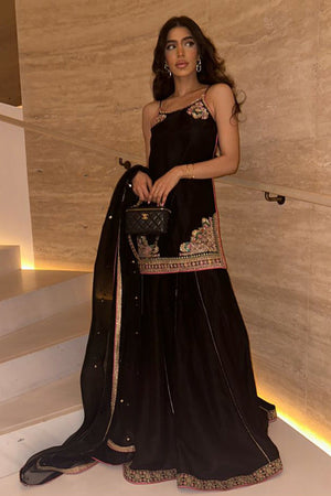 An eye catching jet black heavily embellished short shirt with fitted sleeves. Paired with embroidered sharara and matching black organza dupatta.Shirt length: 32