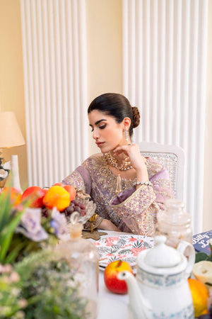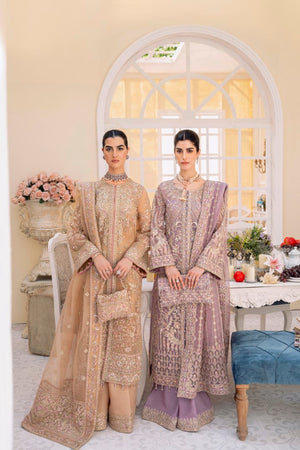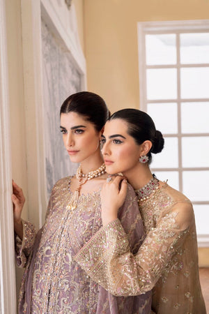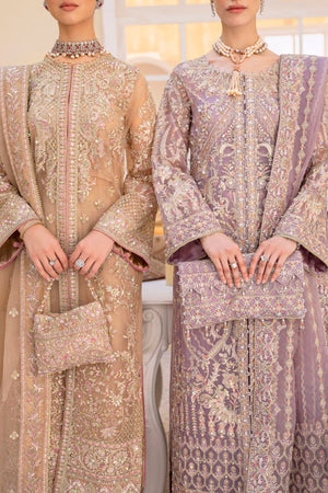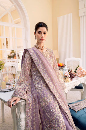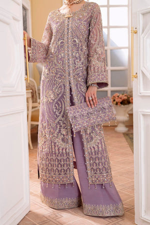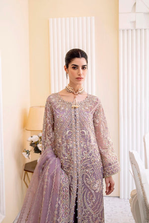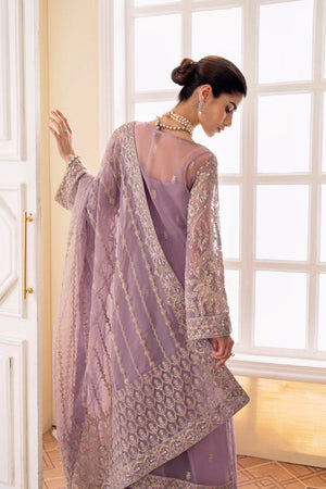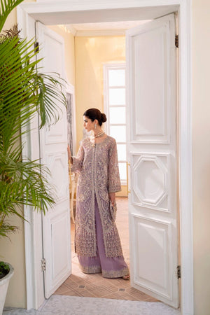This front open organza gown in shades of lilac with pastels needlework throughout is stunningly gorgeous. This piece includes a delicate, breathtaking embroidery with panni, and sequence, that are all over the fabric, along with enhancing its attractiveness with heavy border.This ensemble is worn with flared trousers and an organza dupatta with rich embroidery in the same colour.