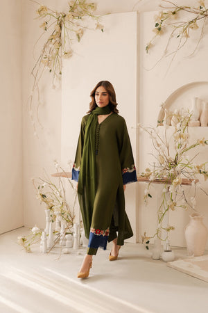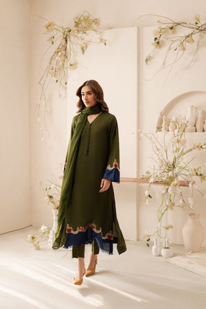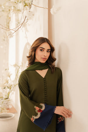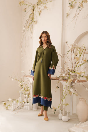 For the woman who finds herself by losing herself to her own music and own rhythms, an ode in lush green. This majestic karandi kurta set is inspired by deep forests, showcasing elegant florals in detailed threadwork combined with fringes in a contrasting shade of deep blue.