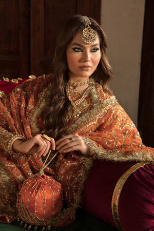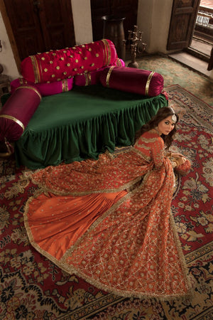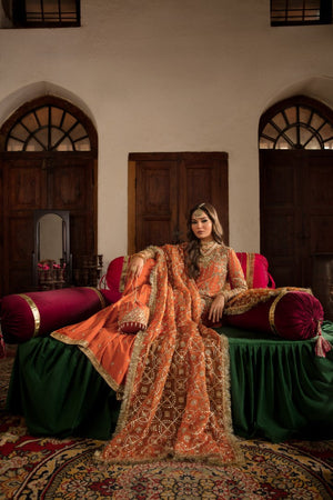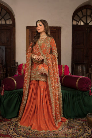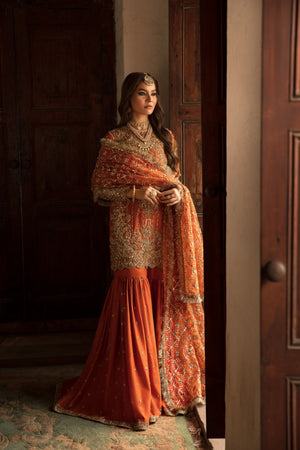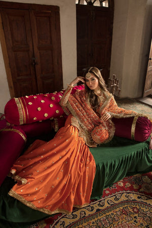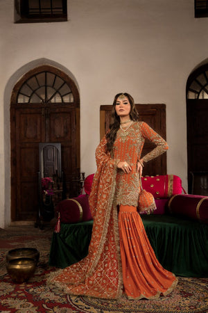 burnt orange Korean raw silk short shirt is paired with a gharara and a heavily embellished gotta work dupatta to create a mesmerizing combination that radiates grace and luminosity. Due to its flawless fusion of contemporary design and classic craftsmanship, this attire is an excellent pick for significant celebrations and cheerful occasions. Vivid orange color exudes vigor and exhilaration. The intricate hand-embellishment, which combines sequins, beads, and thread work, creates a magnificent fusion of textures and colors. The neckline, sleeves, and hemline are carefully highlighted by the embellishments, which also provide a hint of elegance and charm to the whole design.