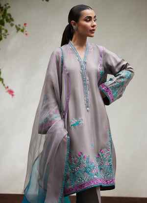 NATALYA CHARCOAL EMBROIDERED RAW SILK SHIRT WITH ORGANZA DUPATTA - Tara Luxe II by Farah Talib Aziz
