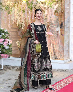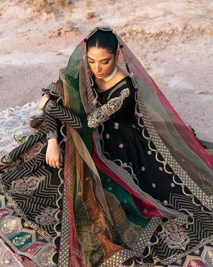Naubahar brings the effervescence touching your aesthetic sense with its black color engulfed in meticulous embellishments. The uniquely structured pishwas based on lawn crafted with meticulous embroideries and organza patches over the neckline and sleeves alongside a screen-printed chevron border and detailed motifs on hem borders. It comes with a multi-hued digital printed organza dupatta ornamented with embroidered borders and a refined trouser finished with dazzling adornments creating a poetic piece that pulls one's heartstrings.