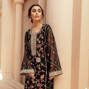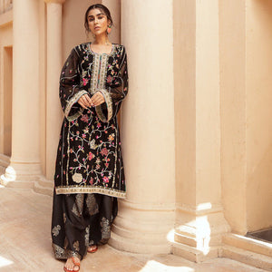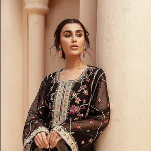 A black cotton net shirt with a harmonious melody of multi coloured embroidery with marori, thread and gota work; which gives this ensemble its luxurious feel. Pair it with a unique block printed swirl shalwar and look ravishing on your winter events.The shipping charges for all articles barring Bridals are as follows: