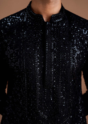 Bold and timeless, this ink black ensemble is crafted from premium Korean silk for a smooth, lustrous finish. The kurta showcases a subtle shimmer that catches the light, adding a refined touch of sophistication. Paired with a classic black shalwar, this look is effortlessly sleek and polished ideal for evening gatherings, weddings, or formal occasions.