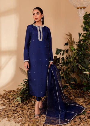 NAZ, Enchanting Silk set in midnight shade. This ensemble is a symphony of luxury. Every detail of this outfit exudes refinement and grandeur, making it the ultimate choice for those who seek to add a chic and mesmerizing touch to their formal ensemble. To elevate the opulence, it is made in longer length,features hand embellished sequins on the neckine and sleeve. It comes with an soft sheer dupatta with minimal silver details.