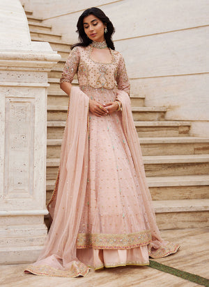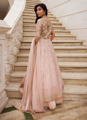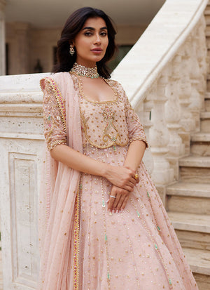 Infused with the softness of peach, this kalidaar embodies artisanal heritage with refined elegance. Crafted in pure net, its voluminous silhouette is delicately adorned with floral bootis and scattered chan, while intricate handwork in kora, dabka, and resham graces its panels with timeless artistry. A handworked border completes the kalidaar, lending depth and sophistication to its graceful flow. Paired with a richly textured zari silk lehnga, the ensemble balances opulence with ethereal charm. The look is crowned with a pure net dupatta, lightly sprinkled with chan and finished with detailed handworked borders, framing the ensemble in cohesive refinement. A true celebration of craft and tradition, this peach kalidaar is designed for moments of festivity and grandeur — romantic, timeless, and exquisitely classic.