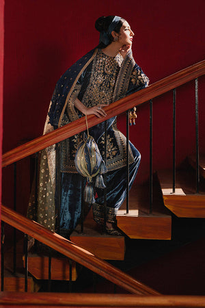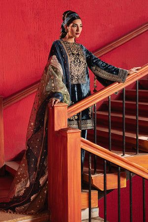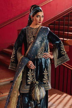 Dive into the serenity of twilight azure with Neelo, a mellow blue velvet ensemble that exudes sophistication. The short shirt is adorned with floral mughal guldasta embroidery and adda work on the sleeves that feature ottoman slit detail, hemline, and neckline, while delicate borders frame its every edge. Paired with an azaar featuring understated embroidery, the set is elevated by a dual-toned organza dupatta in emerald green and royal cerulean adorned with kacha tilla. Neelo is an ode to one of Lollywood’s leading ladies, capturing her elegance and magnetism.