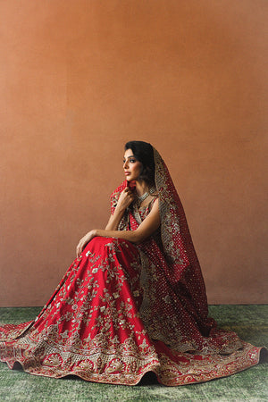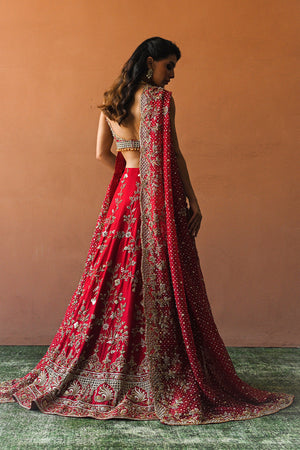 A classic candy red lehnga and a choli cut from pure rawsilk elevates fashion into living poetry. A stunning marriage of zardoze, sequin, and pearl hand embroidery decorates the choli with cutwork details at the hem. A hand embellishment cascading lehnga has floral sprigs making way for a statement hem with peacock figurines and cutworked arches. Paired with a matching organza dupatta featuring sequin and pearl details resembling a starry night and zardoze borders on all four sides.
