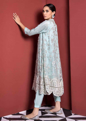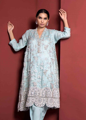 Description: The soft tones of blue, delicate swarovski and pearls, and intricate embellishment details, this ensemble unfolds the most skilled craftsmanship that went into the making of the dress.