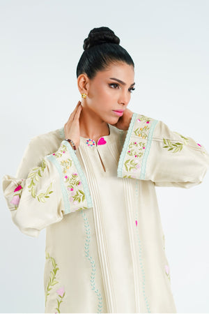 A season classic, this bone hued pure rawsilk co-ord set has our quintessential playful embroidered details in rehsam and applique.